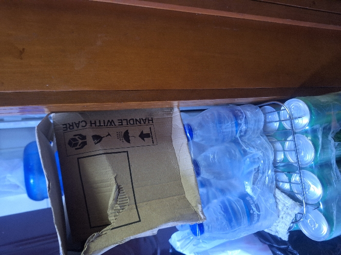 A partially torn cardboard box with handling instructions sits beside bottled water and a rack of canned drinks