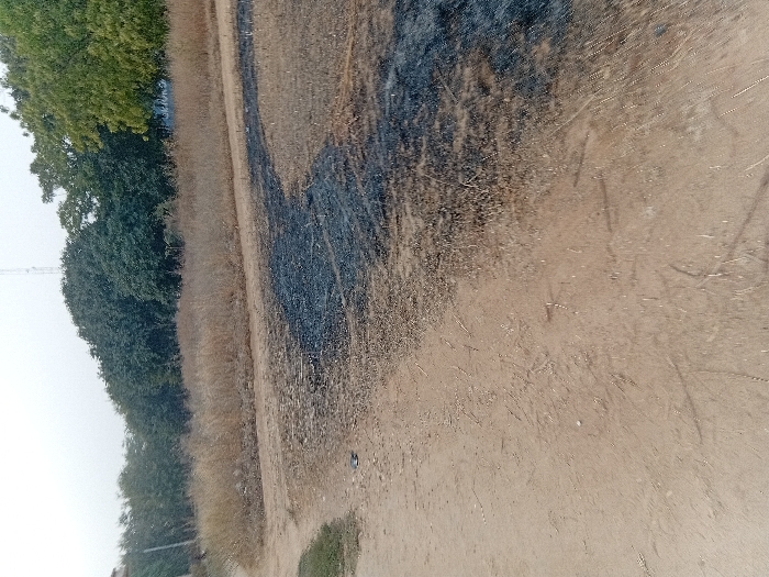 A ground-level shot captures a dirt road with dry grass lining the left edge. A dense row of green trees borders the grass. A significant dark stain stretches across the road's surface, contrasting with the otherwise light-brown dirt. The sky appears overcast and pale. A distant antenna rises above the trees, completing the rural scene.
