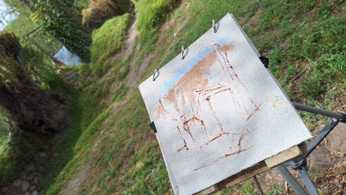 white canvas with an incomplete sketch, mounted on a dark metal tripod easel, set outdoors in Unknown, Unknown. The sketch features reddish-brown linear outlines suggesting a structure or building, partially filled with a light blue wash in the upper section and some scattered beige paint. Three silver-colored binder clips secure the top edge of the canvas. The background on the left displays a steep, green grassy embankment sloping down towards a narrow, reflective body of water, flanked by dark, heavily foliated trees or dense shrubbery. The background on the right consists of an irregular patch of green grass and exposed soil. The scene is observed under natural daylight.