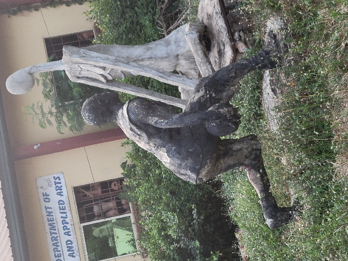 Two sculptures stand in front of a building labeled "Department of Arts and Applied Arts." The first sculpture, in the foreground, is darker and depicts a figure bent over, with a rounded form near its waist. The second sculpture, in the background, is lighter in color and appears to be an abstract human figure with a large, rounded head. Green foliage surrounds the sculptures, and a portion of the building's exterior, including windows and a red trim, is visible.
