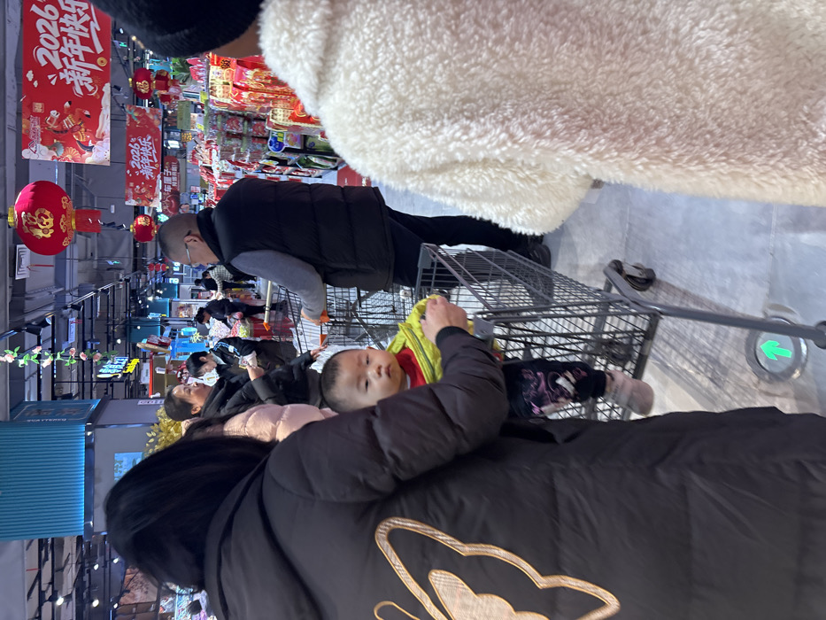 The image depicts an interior scene within a supermarket located in Jiangjin, China. The environment is actively decorated for Chinese New Year, indicated by numerous red lanterns bearing the "福" (Fu) character and banners displaying "2026 新年快乐" (Happy New Year) suspended from the ceiling. In the foreground, a person with their back to the camera wears a black puffer coat featuring a large, light-colored butterfly design on the back. This individual is pushing a metal shopping cart. Seated within the child restraint of this cart is an infant or young child of East Asian ethnicity, wearing a bright yellow-green jacket over a red garment, patterned dark pants, and light-colored shoes. The child faces forward with a neutral expression. To the immediate right, the back of another individual wearing a white, textured, fluffy coat is partially visible. In the midground, an East Asian man with short dark hair and glasses, clad in a grey long-sleeved shirt and a dark sleeveless puffer vest, pushes a metal shopping cart away from the camera, moving towards the right side of the aisle. Further into the store, additional shoppers are visible, some interacting with merchandise or produce displays. The supermarket aisles are stocked with various products, with a noticeable prevalence of red and gold packaging on shelves to the right, consistent with holiday goods. The floor is light-colored tile, interrupted by a circular floor marker featuring a green upward arrow. The ceiling is an exposed industrial type, fitted with artificial lighting and blue paneling.