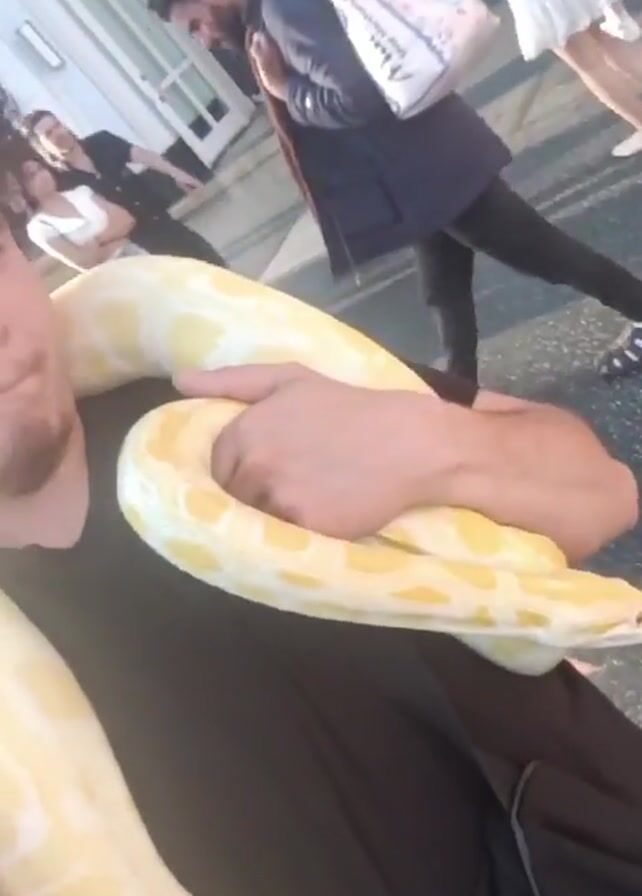 man walking outdoors with a large, light-yellow and white snake wrapped around his neck and shoulders. He's wearing a black t-shirt. The snake is partially held in his hand. The background shows a city street with pedestrians and storefronts. One storefront displays a "50% OFF" sign. The man makes a face for the camera several times.