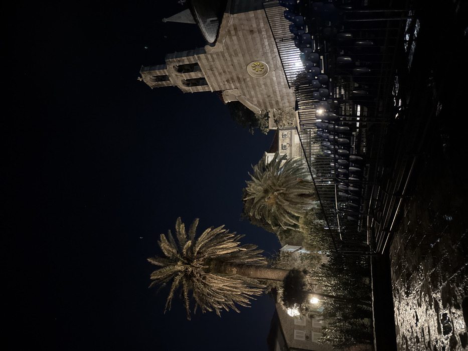 Night scene presents a building with a tower, flanked by two palm trees. Rows of chairs are arranged parallel to the building. The scene is dark, with the building and palm trees illuminated. A street lamp is also visible, adding to the light. The architecture is classic, and the chairs appear to be set for an event.