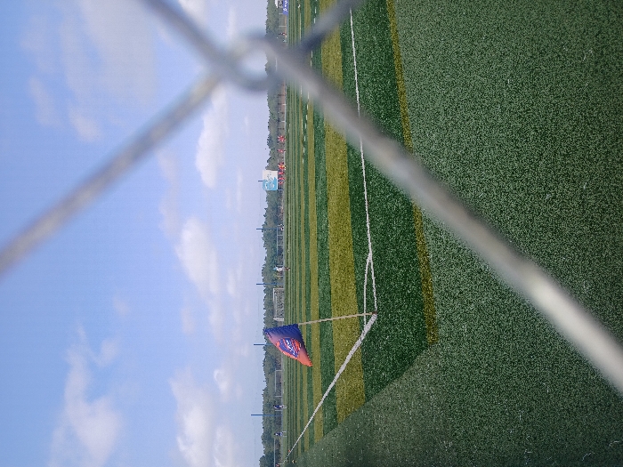 A soccer field with artificial turf alternates green and yellow stripes. A corner flag stands at the near edge. White lines mark the field. In the distance, soccer goals are visible with a few people scattered on the field. A tall billboard stands behind one of the goals. Chain-link fence is visible out of focus in the foreground and the blue sky is visible in the upper left corner.