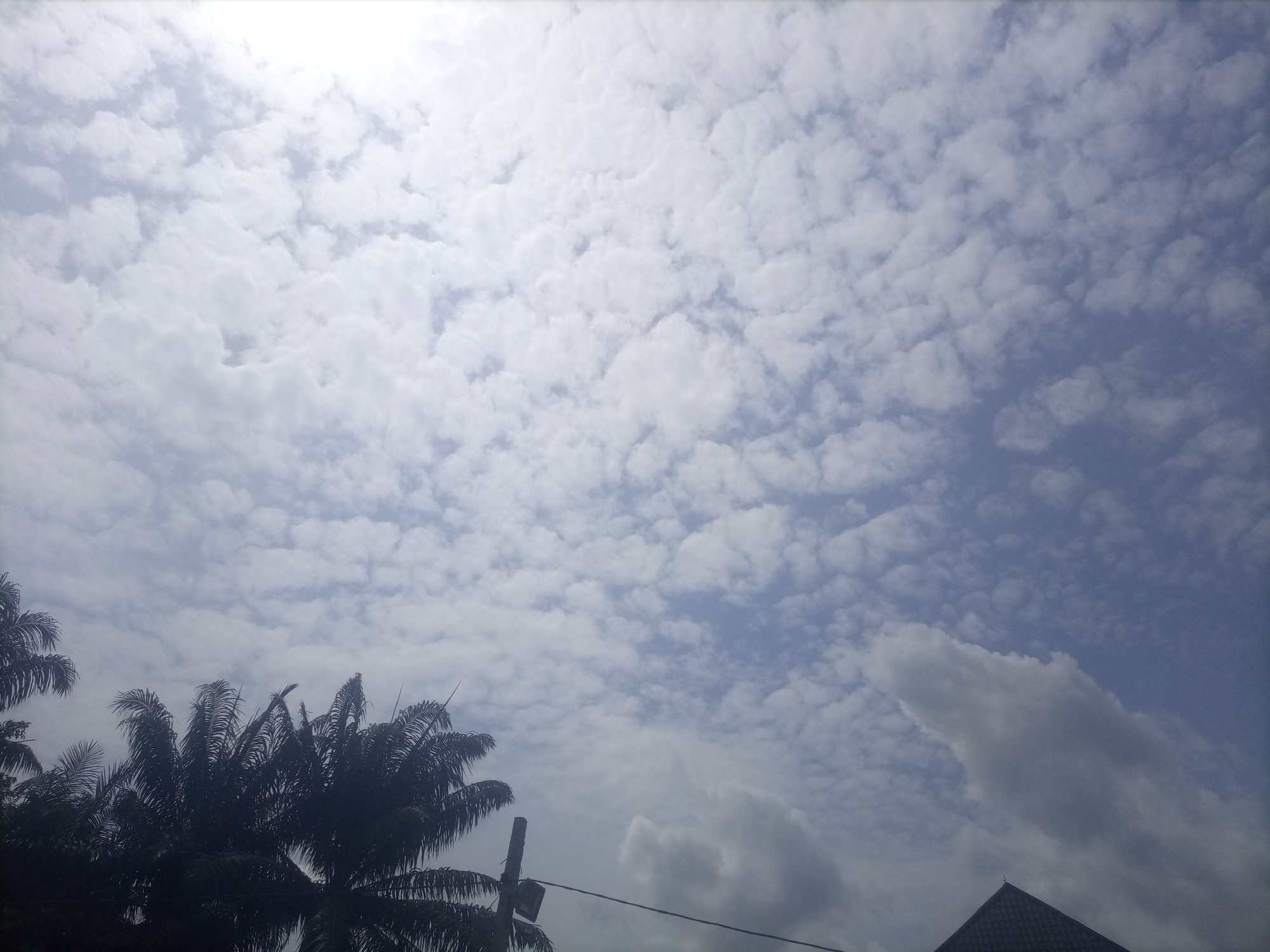 The scene depicts a daytime sky over Alor, Nigeria, largely covered by an extensive formation of scattered white stratocumulus or altocumulus clouds against a light blue background. A bright glare is visible in the upper left quadrant, indicative of direct sunlight. The lower portion of the image reveals elements of the environment: the dark silhouettes of palm fronds occupy the lower left and center-left. Near the bottom center, a dark utility pole with an attached square box and a horizontal electrical wire extends rightward. In the lower right corner, the dark, textured, pyramidal roof of a building is visible, featuring a small white finial or cross at its apex. No individuals, discernible actions, or interactions are present in the frame.
