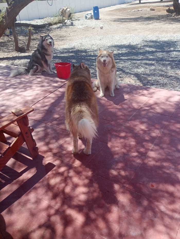 This image, taken outdoors in Pozo Almonte, Chile, depicts three husky-type dogs on a sunny day