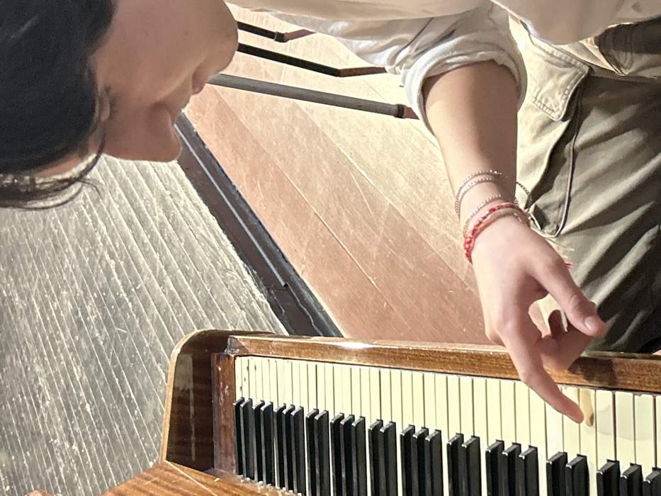 A partial, high-angle photograph captures an unidentified individual pressing a key on an upright piano in an indoor setting