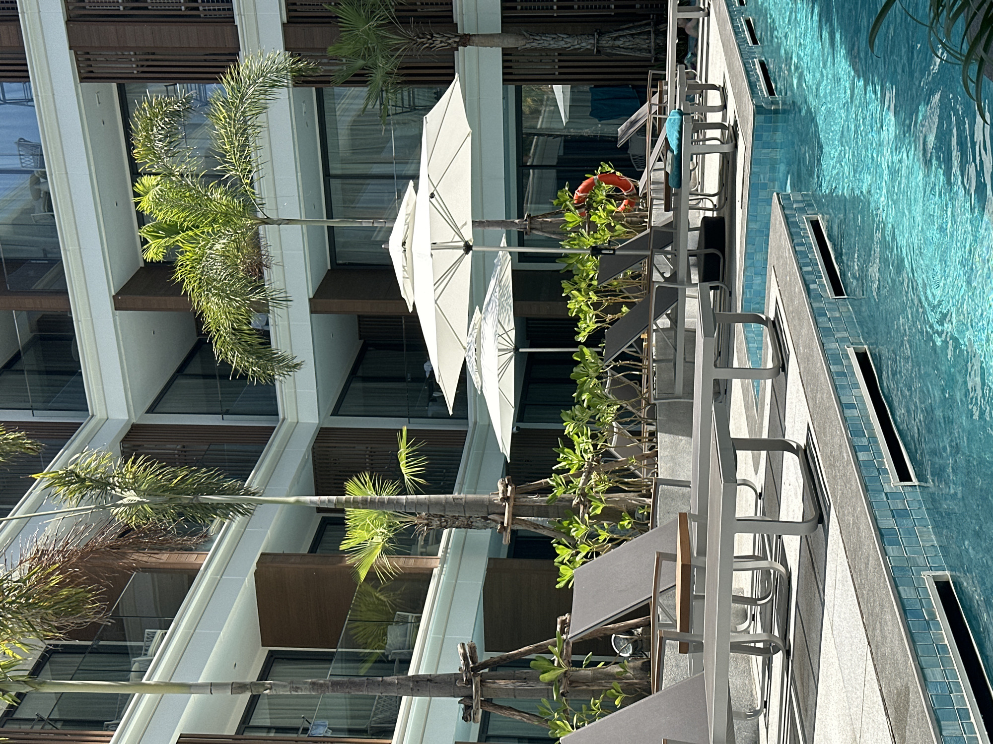 The image depicts a poolside scene in Choeng Thale, Thailand. The pool is lined with blue tiles. Several lounge chairs with gray cushions and frames are arranged along the poolside. White umbrellas provide shade for the lounge chairs. Small trees are planted in between the lounge chairs. In the background, there is a multi-story building with large windows. Palm trees are visible in front of the building. There is a orange life preserver on one of the chairs.