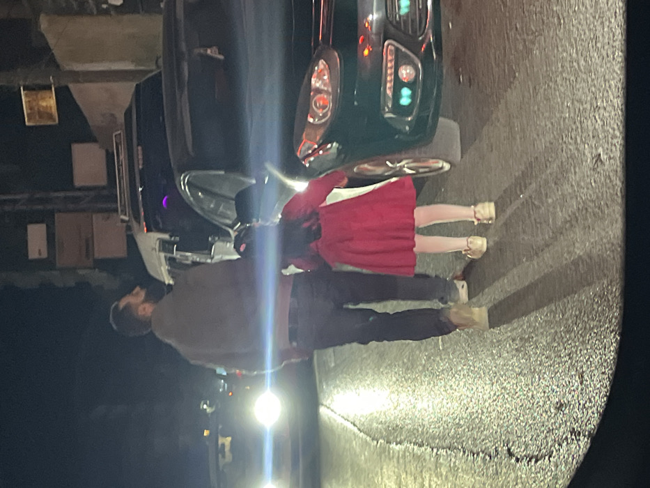 The image displays an urban street scene at night in Al-Kiswa, Syria. An adult male and a young female child are walking away from the camera, positioned on the right side of a wet, reflective asphalt road. The adult male, located to the left of the child, wears a dark jacket, dark trousers, and light-colored shoes. A black face mask is visible pulled down around his chin. He has dark hair and a beard. His right arm is extended, and his hand appears to be holding the left hand of the child. The young female child, situated to the right of the adult male, wears a red dress, white tights, and light-colored strapped shoes. She has long, dark hair. To their right, a dark-colored sedan is parked with its driver's side door open, extending towards the street. The sedan's headlights are illuminated, featuring distinct green-tinted elements. Behind the sedan, a white van or minibus with a visible roof rack is partially obscured. In the far left background, bright headlights from an approaching vehicle cast a significant glare. Further background details include indistinct buildings or walls, a utility pole, and several rectangular objects affixed to a structure. The asphalt road surface shows visible cracks and reflects ambient light, suggesting it is wet.