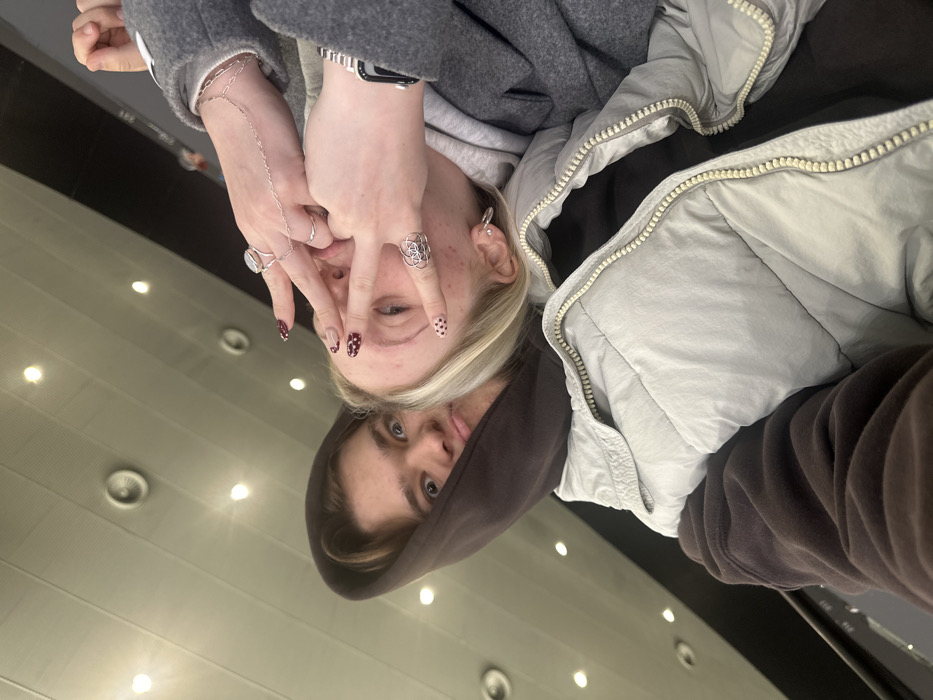 Two people pose close together for a selfie, with the image rotated. The person in the front makes a peace sign over one eye, wearing a large silver ring and silver hand chain. The person in the back wears a brown hoodie. Both faces are partially obscured. They wear winter clothing, including a gray down jacket and a gray wool coat. Ceiling lights are visible in the background.