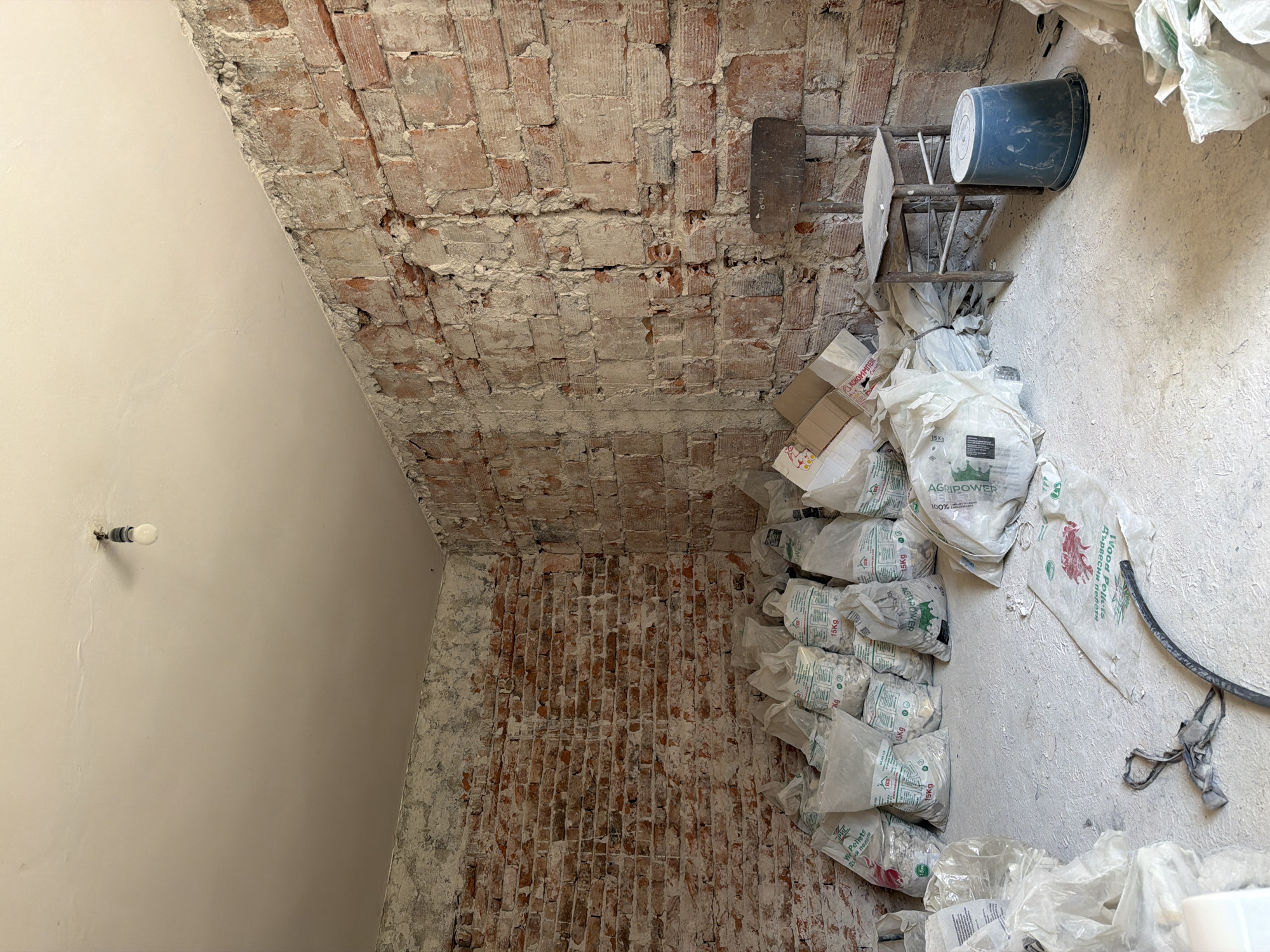 An interior room in Zlatograd, Bulgaria, is depicted in a state of partial demolition or ongoing construction. The scene features two visible exposed brick walls, displaying remnants of light-colored plaster and mortar. The ceiling is a uniform light off-white color, from which a single bare incandescent light bulb hangs centrally. The floor is entirely covered in a thick layer of white dust or powdery material. Piled against the left wall and extending into the foreground are numerous translucent plastic bags, many marked with "15KG," "AGRIPOWER," "W. Pellets," and Cyrillic text, indicating granular contents, specifically wood pellets. A dark, worn wooden chair with a backrest stands near the right wall, adjacent to an inverted dark blue plastic bucket. Several collapsed cardboard boxes are scattered near the chair and among the bags. A dark hose or cable is visible on the dusty floor in the lower-left area, near torn plastic sheeting. The room is uninhabited.