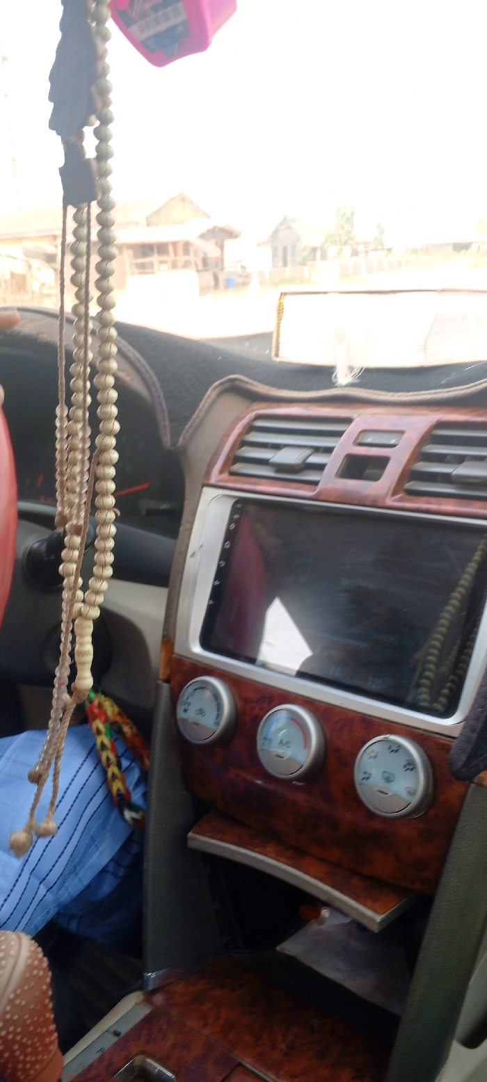 The image depicts the interior of a vehicle, viewed from a passenger's perspective, looking towards the dashboard and out the windshield. In the foreground, hanging from what would be the rearview mirror attachment point, are multiple strands of light-colored, spherical beads, consistent with a rosary or tasbih, alongside a pink, rectangular object. The upper dashboard is covered with a black fabric mat. To the left, a portion of a red-orange steering wheel rim is visible. The center console features an aftermarket infotainment system with a large, dark screen displaying reflections. This unit is integrated into a panel with dark brown, wood-grain style trim. Below the screen are three circular, chrome-accented climate control knobs, each with light blue markings. Beneath these controls, an open cubby reveals a small white object within. More of the matching wood-grain trim extends downwards around the gear selector area. Air vents with horizontal slats are positioned above the infotainment screen, also surrounded by the wood-grain trim. To the lower left, the leg of a person is visible, clad in light blue fabric with faint vertical stripes. A multi-colored woven accessory is seen on the wrist or arm, and part of a light brown shoe with a textured sole is visible. Through the vehicle's windshield, a blurred exterior environment is visible under bright, possibly hazy conditions. Several low-rise, rudimentary structures, possibly houses or sheds, with light-colored walls and dark roofs are discernible in the background. The ground appears bare or unpaved. No specific identifying landmarks or features of an urban environment are present. The image does not contain sufficient visual information to forensically identify the location as Mexico City, Mexico. The visible exterior environment appears more consistent with a rural or semi-developed area rather than an urban center.
