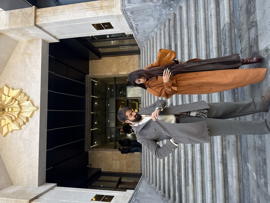 The image displays two individuals, a man and a woman, standing on a wide, light-colored stone staircase leading to the entrance of a grand building in Tsakhkadzor, Armenia. This building is identifiable as the Tsakhkadzor Marriott Hotel, characterized by its distinctive light stone facade and the large, golden, geometric bas-relief positioned centrally above the main entrance. The man, situated on the left, possesses dark hair and a beard. He is dressed in a cream V-neck sweater, olive green trousers, a dark belt, and a mid-thigh length grey double-breasted coat with prominent silver buttons. A striped scarf (cream, brown, grey) is tucked into his coat. He wears a watch on his left wrist and dark brown shoes. His right hand is near his chest, appearing to adjust his coat, while his left hand is in his coat pocket. His gaze is directed downwards and slightly to his right. The woman, positioned on the right, has long dark hair cascading over her shoulders. She wears a long, oversized, rust-brown (or burnt orange) suede-like trench coat over a dark brown garment. She holds a shiny, light brown clutch bag under her left arm. Her right hand is positioned near her waist, possibly adjusting her clothing. She displays long, light-colored fingernails and wears dark brown ankle boots. Her gaze is directed downwards. In the background, several less distinct figures are visible near the building's glass entrance doors, which reveal a brightly lit interior. The wide stone staircase comprises numerous steps. The building's entrance is flanked by large stone pillars, each featuring a small, dark plaque. A dark, possibly black, overhead structure extends above the entrance.