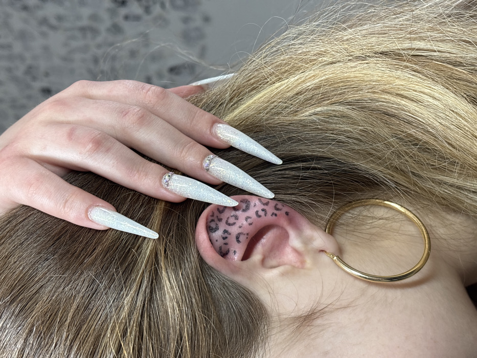 A close-up image focuses on the right side of an individual's head and their left hand. The individual's hair is long, light brown, and partially pulled back to reveal the right ear. The inner contours of the right ear, including the concha and helix, are covered with a black leopard print tattoo. A large, plain gold-colored hoop earring is present in the right earlobe. The left hand is positioned adjacent to the ear, with fingers slightly splayed. The fingernails on this hand are extremely long, stiletto-shaped, and coated in a glittery white acrylic polish. Four visible nails are each adorned with a horizontal line of small, clear rhinestones positioned near the cuticle. The background is uniformly light gray and out of focus, consistent with an indoor setting. No specific geographical markers are present to identify a location within Bat Yam, Israel.