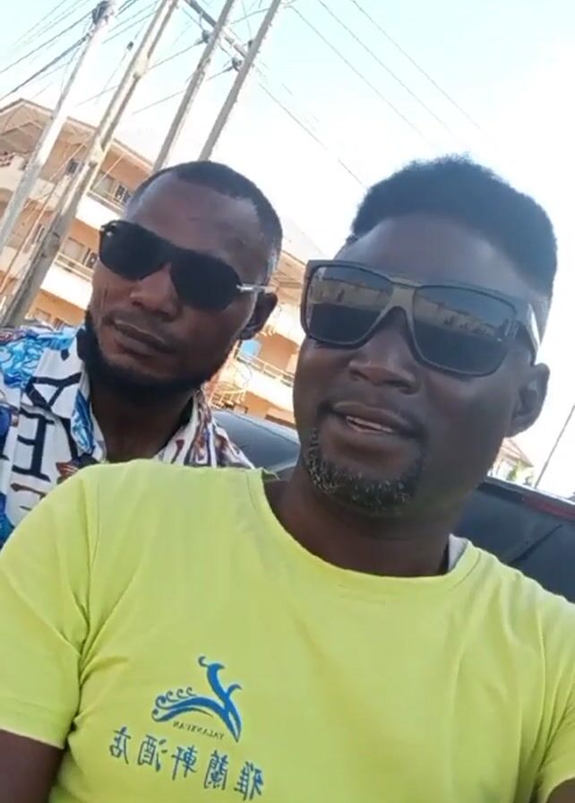 Two men are in a close-up shot. The man in the foreground wears a light yellow t-shirt with Chinese characters and a blue image printed on it. He has dark sunglasses and a slight beard. The second man, behind him, is wearing a white button-down shirt with a blue and white pattern. He also wears dark sunglasses. The background features a light blue sky, buildings, and power lines. The camera angle is slightly upwards, suggesting it might be handheld.