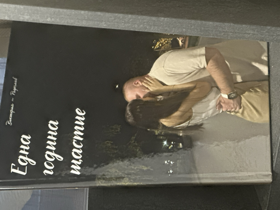 The image displays a vertically oriented, glossy-covered book or photo album, resting on a dark, flat surface. The cover is predominantly black. White Cyrillic text at the top reads "Една година щастие" (One year of happiness), with the names "Виктория ~ Радослав" (Victoria ~ Radoslav) in smaller script below. The lower portion of the cover features a photograph of a male and female couple engaged in a kiss. The female, with long dark hair, wears a light-colored sleeveless top and a light-colored skirt, with her left hand on the male's neck. The male, with short hair, wears a light-colored short-sleeved t-shirt, has his left arm around the female's waist, and wears a white-strapped watch on his left wrist. The background of the photograph is dark, indicating a nighttime setting, with indistinct, blurred lights and minimal foliage visible in the distance. The overall scene is situated in the city of Sofia, Bulgaria.
