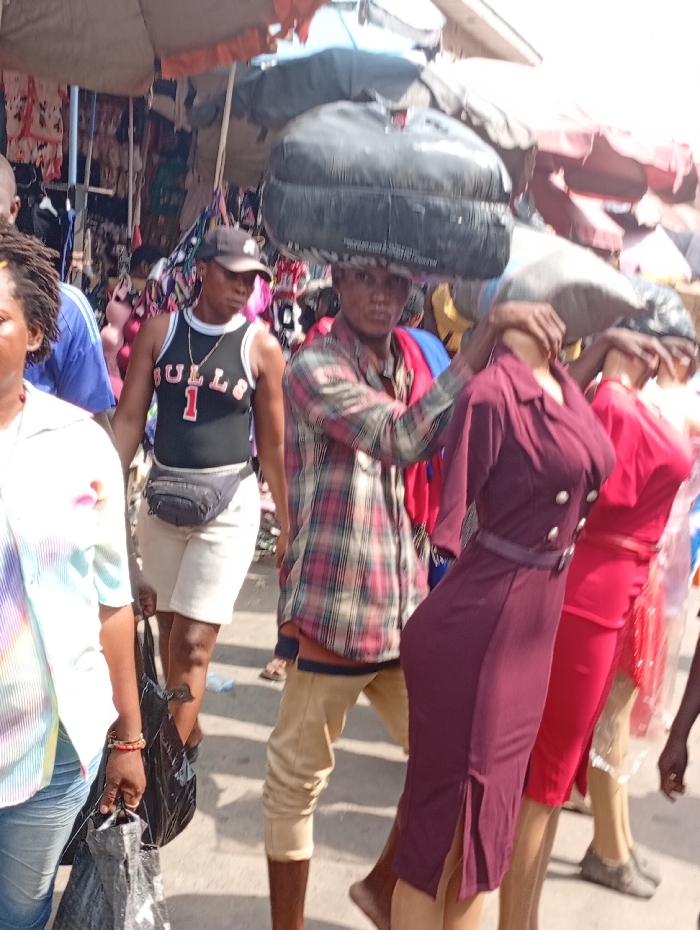 A man in a plaid shirt carries a large bag on his head, steadying a mannequin wearing a burgundy dress. Another person in a Bulls jersey and cap walks behind with a fanny pack. Other individuals surround them in a bustling outdoor market scene. There are storefronts with clothes displayed and red and orange umbrellas above. There are mannequins in red dresses as well.