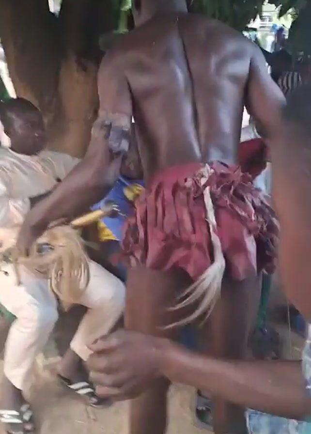 group of people gathered in what appears to be an outdoor setting, potentially a village or rural area with trees and exposed dirt ground. Several individuals are visible, with focus on a man wearing a tattered red skirt and some form of armbands, and holding what looks like a golden staff or horn. He is shirtless and has dark skin. A person is seated, partially obscured, wearing light-colored clothing. Other individuals are standing around, some wearing traditional African attire, while others are dressed in Western clothing. The scene appears to have a festive atmosphere as the people are dancing.
