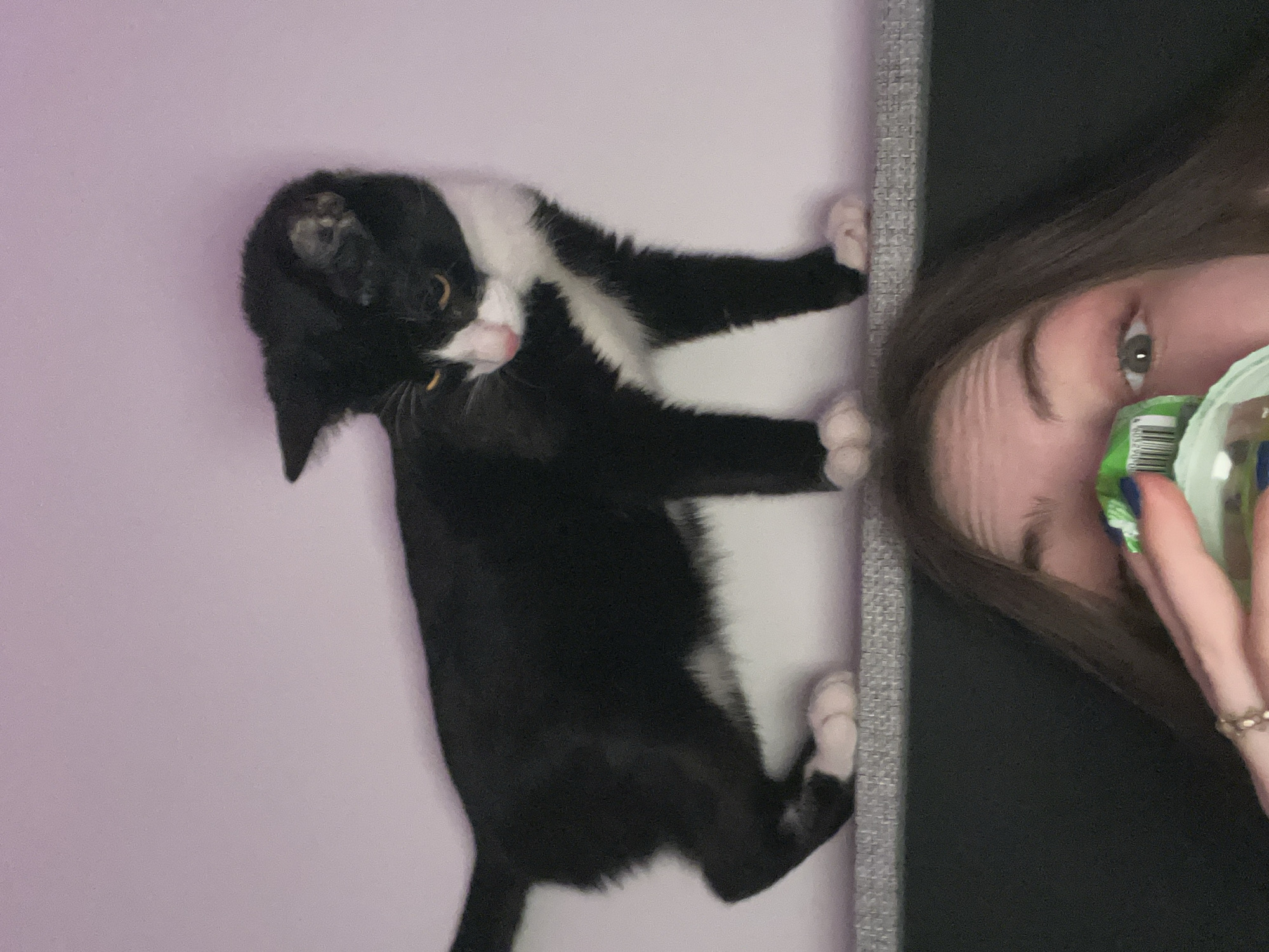 A young woman is taking a selfie with a black and white cat. The woman is holding a green and white object up to her mouth. The background is a lavender wall. A grey textured surface is between the woman and the cat. The image was not taken in Saint Petersburg, Russia.