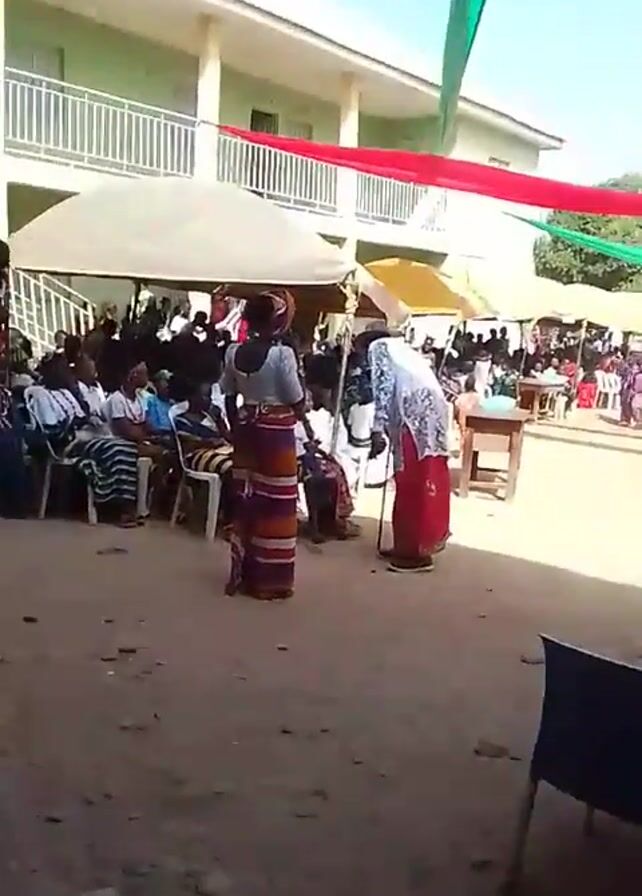 n outdoor event occurring in what appears to be a schoolyard or public area. There is a building with two floors on one side. The event area is decorated with green and red streamers. Numerous people are seated under awnings or umbrellas. In the foreground, two people stand; one is wearing a striped skirt and a white top, the other is wearing a white top and a red skirt. The person in the red skirt is bending over, using a walking stick. The ground is a dirt surface mixed with rocks and debris. Several black chairs are scattered around in the foreground. There is movement as people walk through the event area.