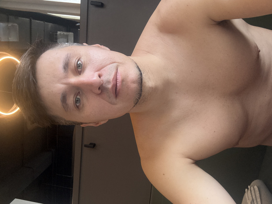 A fair-skinned, shirtless man with short brown hair and green eyes gazes directly at the camera