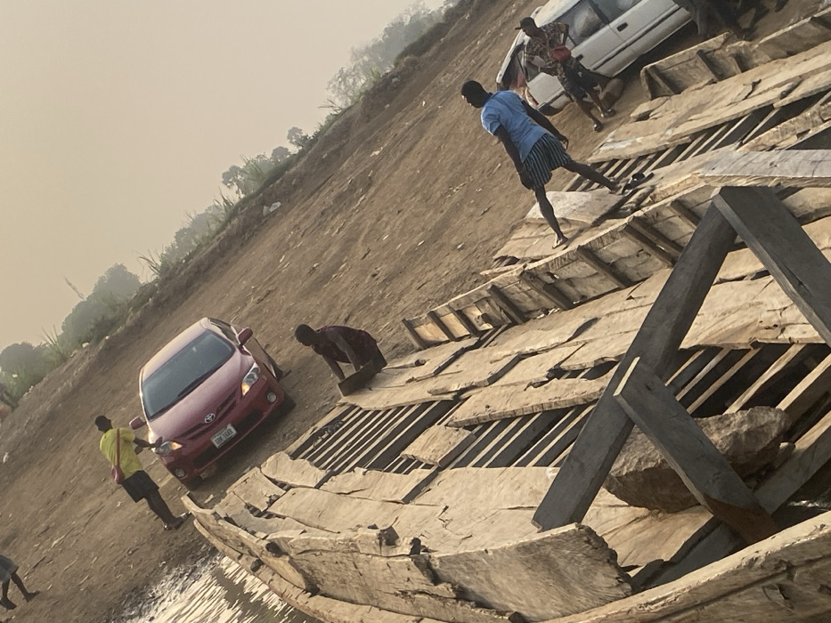 A tilted scene captures a red car positioned on a dirt incline near water. Several men are seen around what appears to be a large, dismantled wooden structure, possibly a boat under construction or repair. One man is leaning on the car, while others are walking or standing on the wooden planks. A white vehicle is visible further up the incline. The sky is overcast.