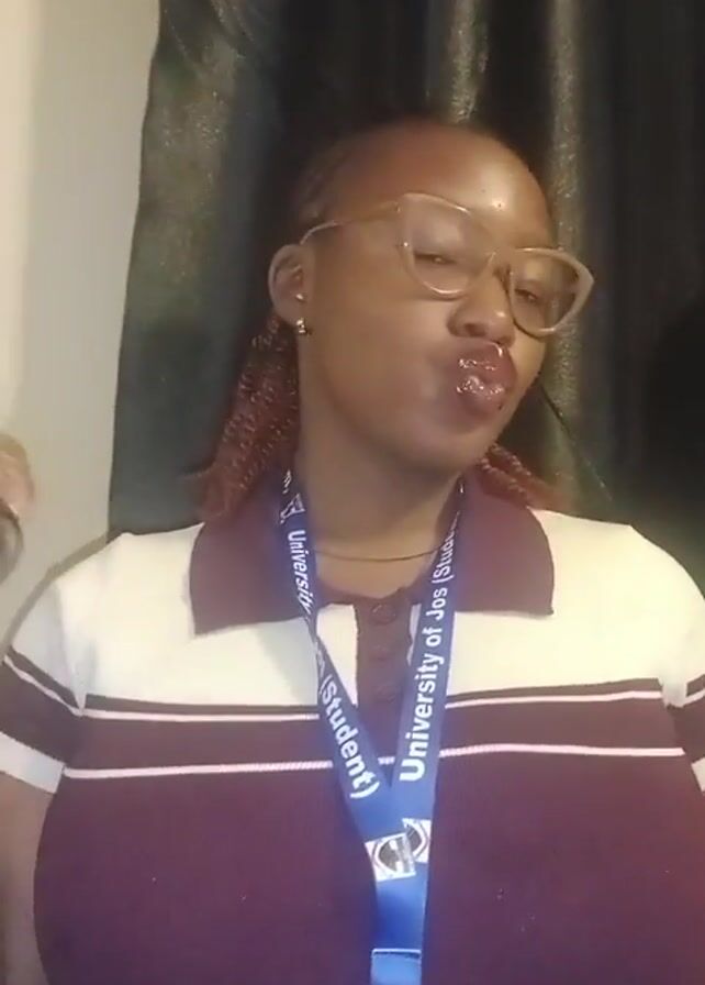 A woman with dark skin and glasses stands in front of a dark curtain. She wears a white and burgundy shirt with a "University of Jos (Student)" lanyard. She puckers her lips, takes out a small brown glass bottle with a gold cap, and examines it.