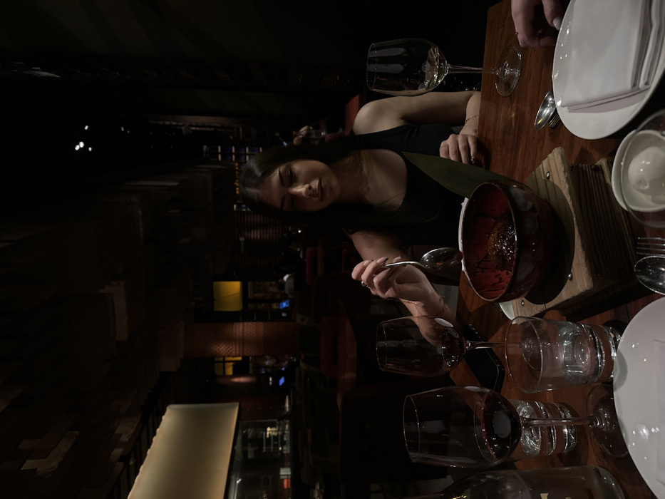 A woman sits at a table in a dimly lit restaurant, holding a spoon and facing a bowl