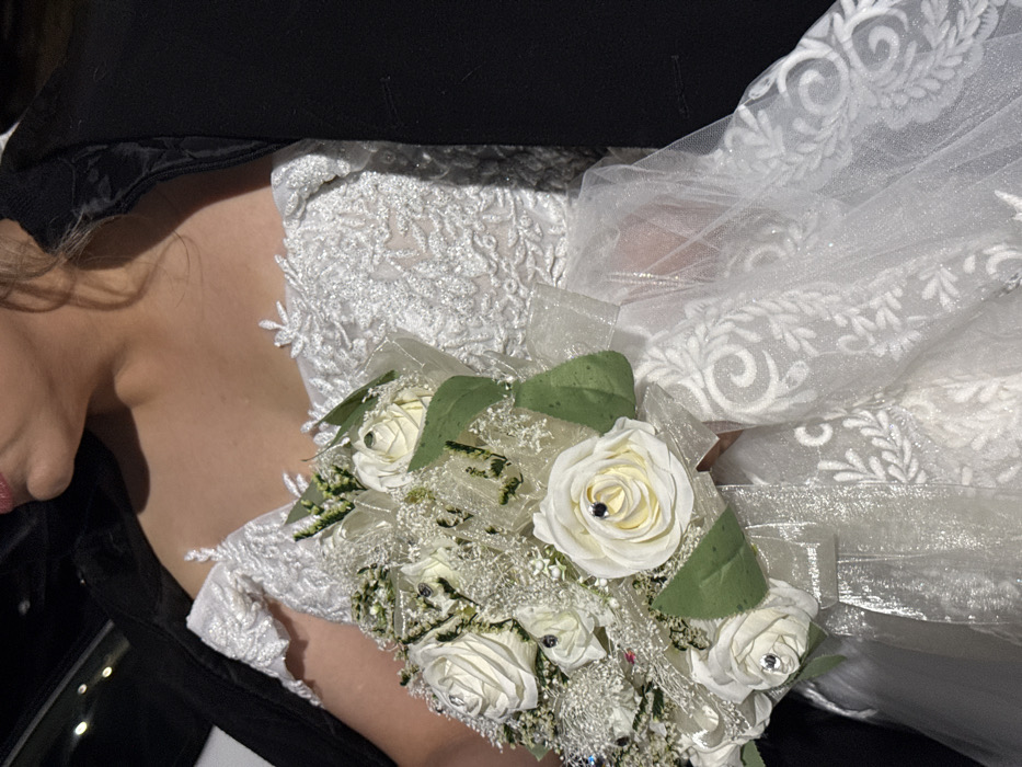- "A bride is holding a bouquet of white roses adorned with small gemstones" by FM-avfjN2, licensed under CC BY 4.0