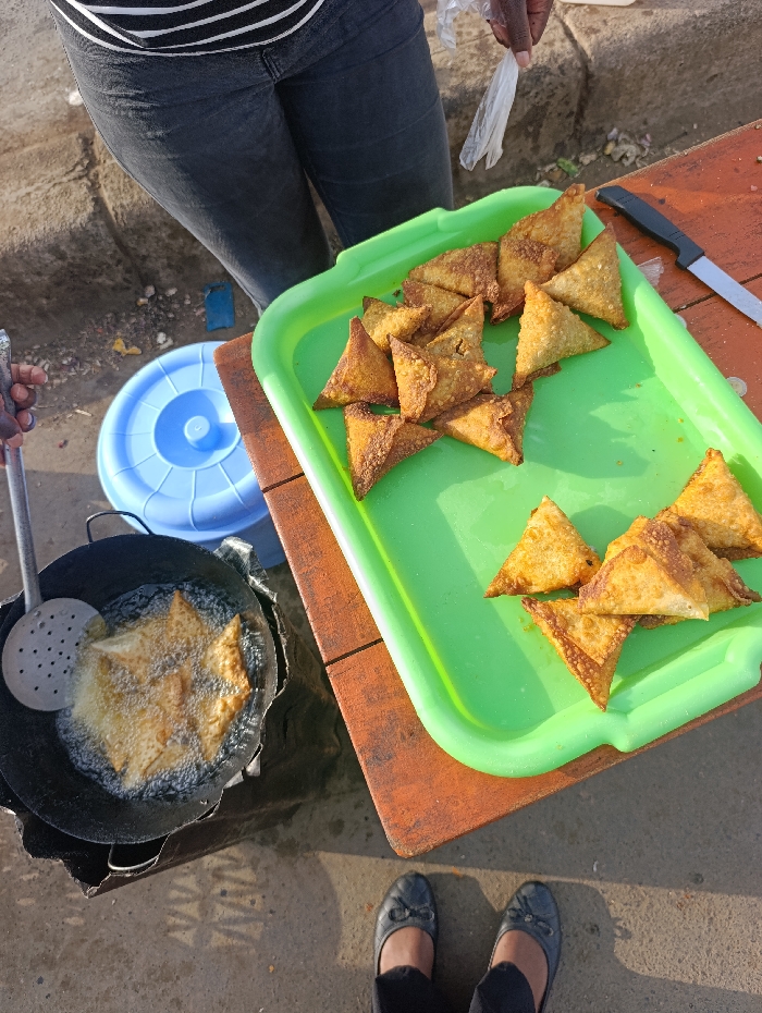 The image depicts an outdoor food preparation and selling scene in Kiuu ward, Kenya, captured from an overhead perspective. In the foreground, a person's feet, wearing dark flat shoes and dark trousers, stand on a concrete ground surface. To the left, a black frying pan sits on what appears to be a dark fabric or plastic sheet on the ground, containing several triangular pastries actively deep-frying in bubbling oil. A silver slotted spoon is partially visible, held by a hand, positioned inside the pan. A light blue plastic container with a lid is on the ground next to the frying setup. To the right, a bright green plastic tray is placed on a brown wooden surface. This tray holds a significant quantity of cooked, golden-brown triangular pastries, arranged in multiple piles. A silver knife with a black handle rests on the wooden surface next to the tray. A person, visible from the waist down, stands behind the wooden surface, wearing dark jeans and a striped shirt. Their right hand holds a clear plastic bag. The concrete ground shows shadows consistent with outdoor lighting.