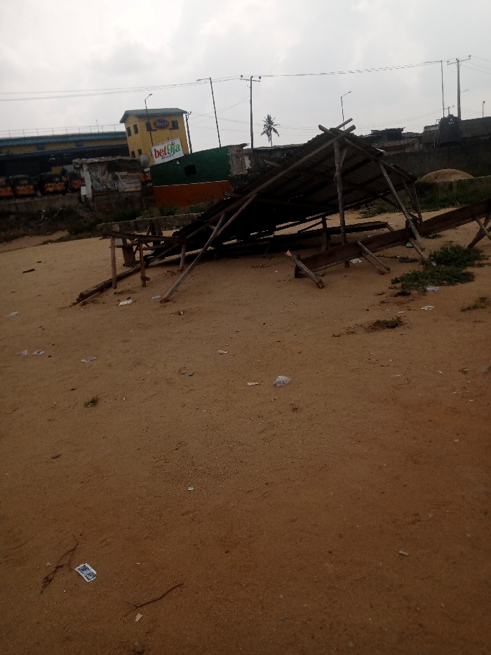 The scene depicts an unpaved, reddish-brown dirt and sand area within Ikorodu, Nigeria, under an overcast sky. In the midground, a largely collapsed wooden structure with a corrugated metal roof lies extensively damaged, its wooden beams splayed across the ground. Fragments of wooden tables or benches are interspersed with the collapsed structure. Scattered plastic bags, wrappers, and other refuse are visible across the sandy foreground. To the right of the collapsed structure, a small patch of green vegetation is present. In the background, from left to right: a blue-painted pedestrian overpass or bridge spans horizontally. Beneath the bridge, multiple orange commercial vehicles, likely buses or trucks, are parked or abandoned. Central to the background is a two-story yellow building featuring a prominent "bet9ja" sign on its exterior. Adjacent to this building are a green wall and an orange wall, indicating additional structures. Further to the right, utility poles with overhead power lines, a single palm tree, and various indistinct urban structures are visible. No individuals are present, and no actions or interactions are depicted.