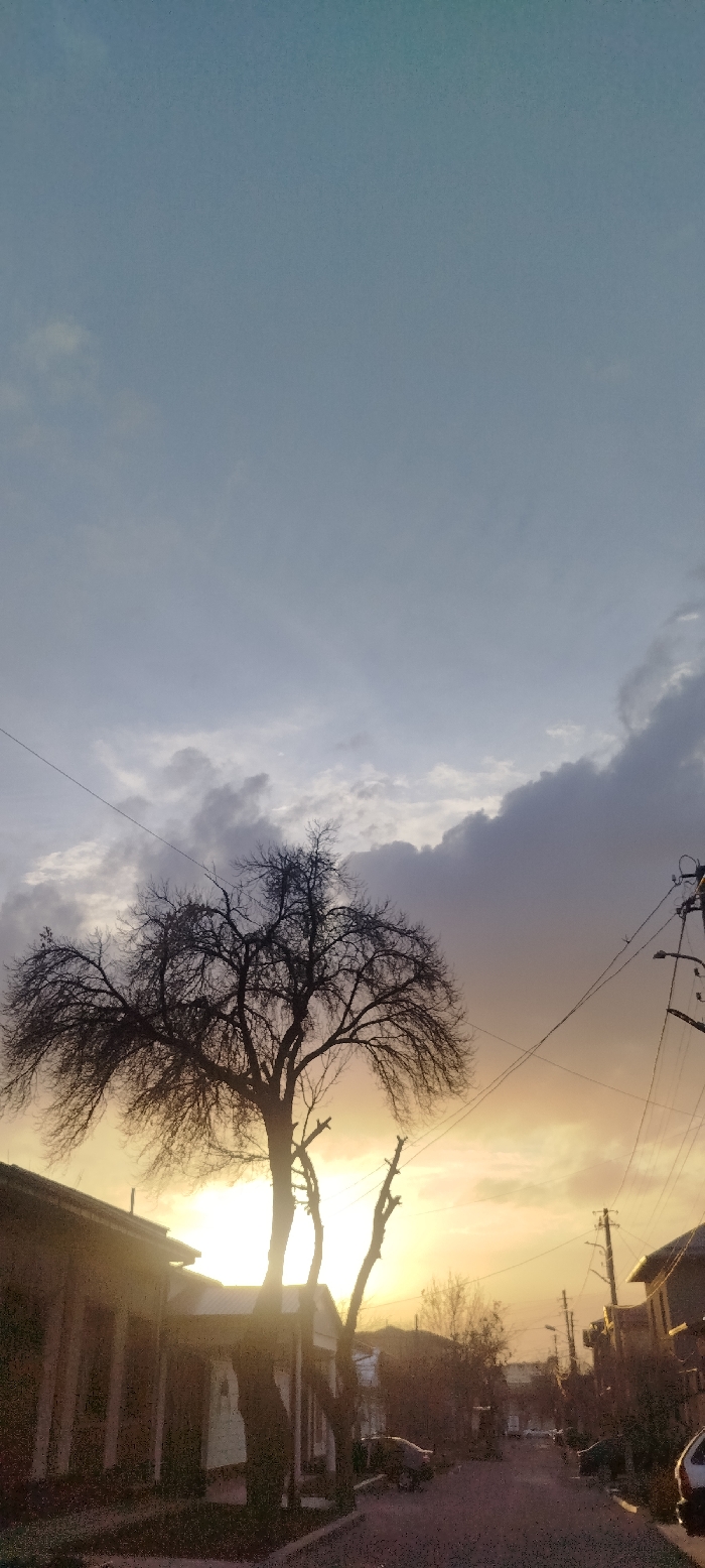 A stark, leafless tree dominates the foreground against a sunset sky transitioning from soft yellow to blue-grey. The sun, low on the horizon, casts a radiant glow behind the tree, silhouetting its branches. Buildings line a street fading into the distance, with parked cars visible along the curbs. Telephone poles with wires stretch across the scene. The sky is partially covered with clouds.