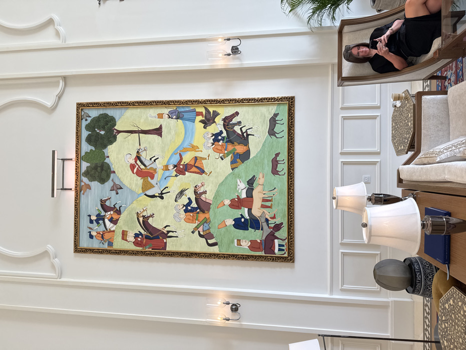 The image captures an upscale interior, consistent with a lounge or lobby of a luxury hotel in Doha, Qatar. Dominating the central white wall is a large, rectangular framed artwork, appearing to be a Persian-style tapestry or painting. This artwork depicts an elaborate hunting scene featuring multiple figures in traditional attire, many mounted on horseback, pursuing various animals including deer, small game, and birds with the aid of falcons and hounds, all set within a landscape of green hills, scattered trees, and a winding blue river. An overhead picture light illuminates the artwork, and two glass-shaded wall sconces flank it on the white, classically molded walls. In the foreground, to the right, a woman with dark hair, wearing a dark dress and sunglasses perched on her head, is seated in a beige armchair, actively using a smartphone. Adjacent to her is a hexagonal side table with intricate inlay, holding two cups and small white containers. To the left, a dark console table displays two white-shaded table lamps, a dark blue book, and a dark grey spherical decorative object resting on a patterned base. Sections of upholstered furniture, including a light-colored sofa or bench, and a patterned floor rug are visible at the bottom of the frame. A potted plant is partially visible on the far right.