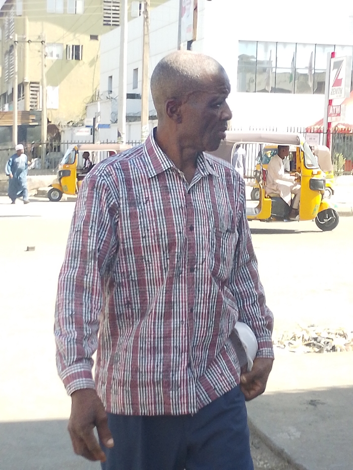 An adult male, appearing to be of African descent, is centrally positioned in the foreground of an urban street scene in Sabon Gari West, Nigeria, during daylight hours
