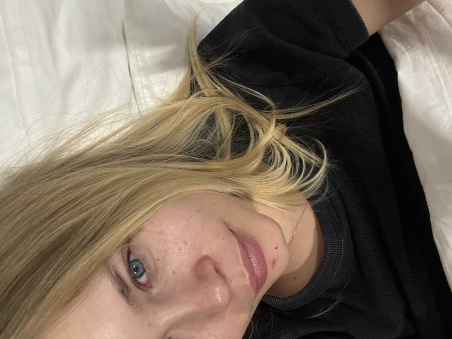 A person with blonde hair and blue eyes lies on a white bed