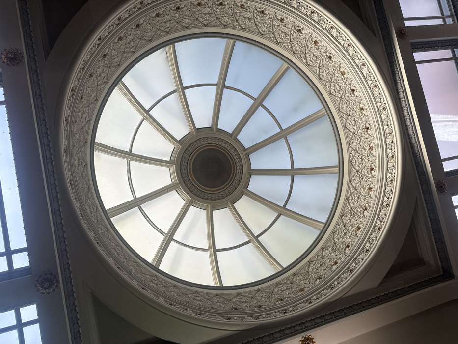 The image displays an upward view into the interior of a building, centered on a large, circular glass dome or skylight