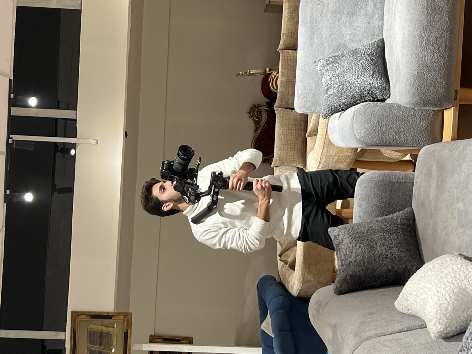 A man in a white sweater and black pants holds a camera mounted on a gimbal stabilizer. He appears to be filming. The setting is indoors, possibly a furniture store. There are multiple sofas and chairs in various colors and textures in the background. The lighting is somewhat dim. There's a window or reflective surface with lights visible on the left side of the frame. Some gilded frames are seen near the bottom of the image.