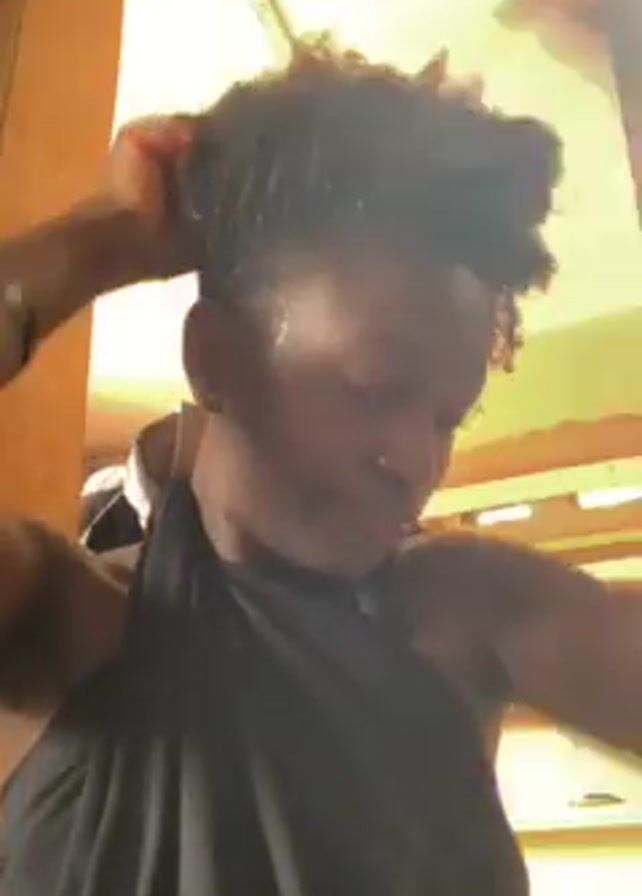 A person is shown indoors, waist-up, wearing a black halter top, pulling their short, dark, curly hair up into a small puff on top of their head, with a pink comb in their hand