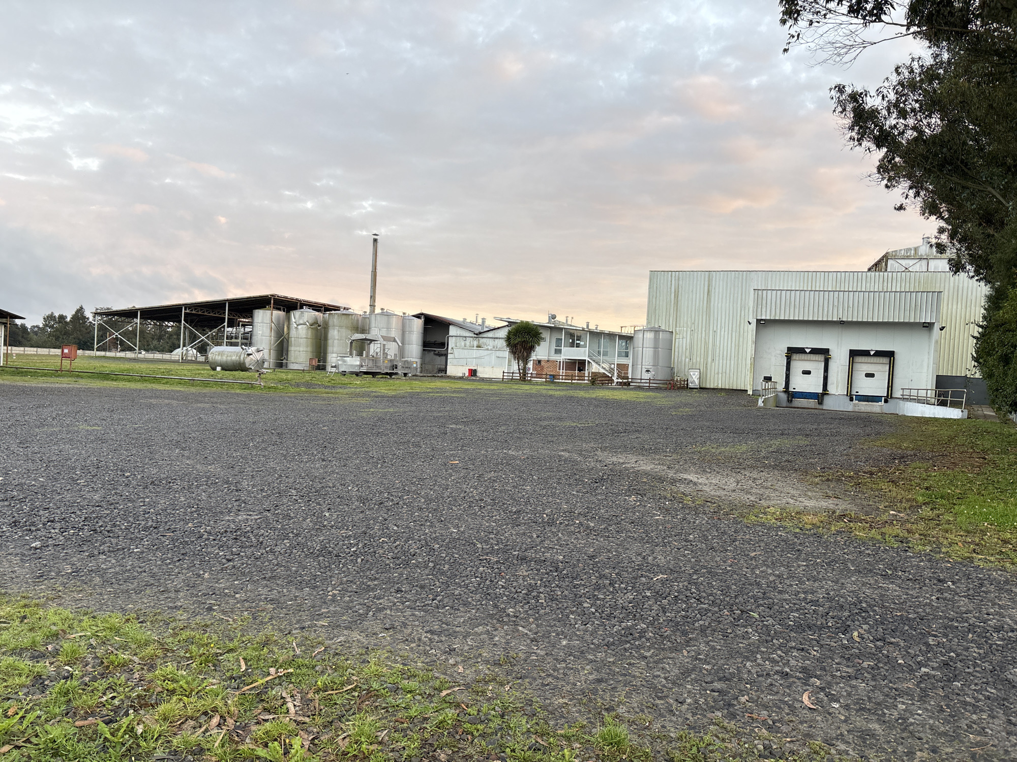 The scene depicts an industrial area in Purranque, Chile. In the foreground is a large expanse of dark gravel ground interspersed with patches of green grass and fallen leaves. The middle ground features several industrial buildings, including metal silos and a large white warehouse with two blue and white loading docks. A metal-framed structure covered with a dark roof sits to the left of the silos. A tall metal chimney rises from the industrial complex. A scattering of trees and greenery is visible in the background and along the right side of the frame. The sky is overcast with a mix of grey and light pink clouds.