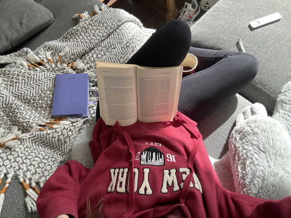 One individual, gender not discernible, is depicted reclining on a gray upholstered couch in a domestic setting within the city of Peru, United States. The person wears a red hooded sweatshirt with "NEW YORK CITY" and "16" embroidered text on the front, and black leggings. An open physical book with visible text on both pages rests on the individual's lap. To the upper right, on a textured gray and white herringbone blanket with white and orange tassels, a closed purple notebook with an elastic band is present. A tan mug is partially visible near the individual's right knee. A white, fuzzy decorative pillow is situated under the individual's left side. To the lower right, on the couch cushion, a white remote control with a silver circular button is visible. Direct sunlight illuminates sections of the scene, casting distinct shadows.