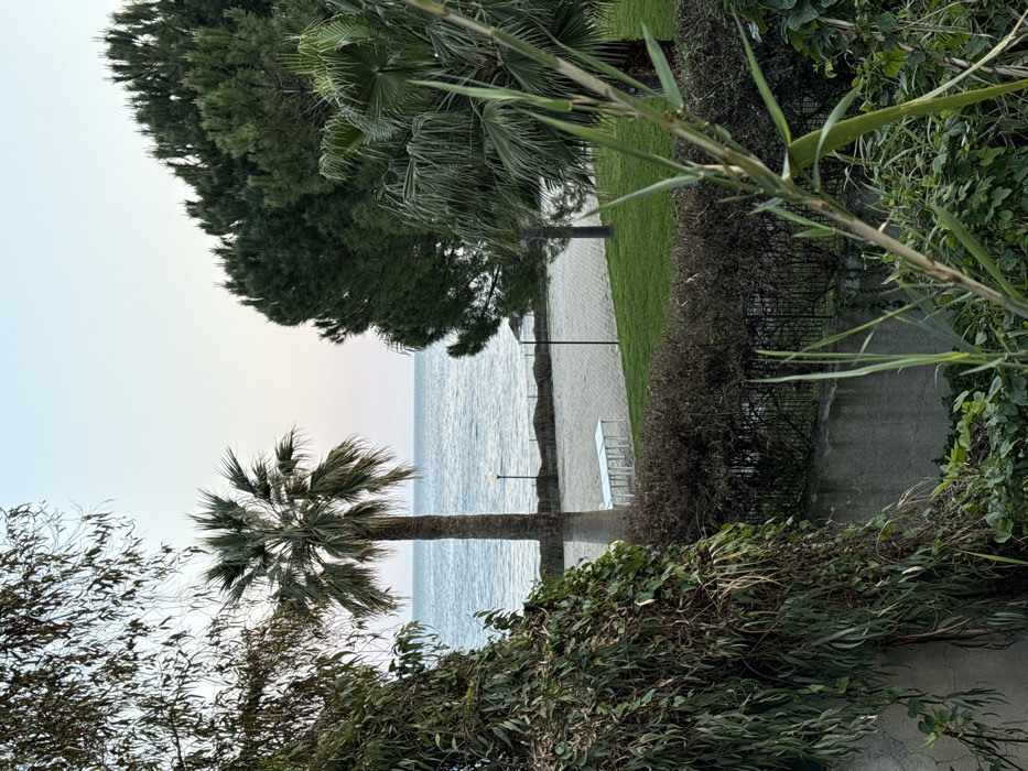 The image depicts a tranquil coastal scene in Sanremo, Italy, viewed from a slightly elevated vantage point, likely during twilight hours due to the soft, diffused lighting. In the immediate foreground, dense green and dark foliage, including what appear to be eucalyptus-like leaves on the left and broad grass blades on the right, partially frame the view. Below this vegetation, a low, weathered concrete wall is visible, topped by a black metal fence or railing. Behind this fence, a dark, manicured hedge runs horizontally across the lower midground. The midground features a light-colored sandy beach area on the left, transitioning into a neatly trimmed green lawn on the right, separated by a light-toned paved promenade. On the sandy beach, a single white, rectangular table, possibly plastic or metal, is positioned. Two slender black lampposts with globe-shaped lights are visible: one stands on the sand near the table, and another is positioned on the lawn further to the right. A low, dark barrier or fence runs along the water's edge on the beach. A tall palm tree with a thick, textured trunk and green fronds stands prominently on the sandy area. To its right, a dense cluster of tall, dark green evergreen trees, likely pines, occupies the mid-right portion of the frame, with another partial palm tree visible on the far right. The background consists of the calm, light blue-green sea, extending to the horizon. The sky above is a clear, pale blue, transitioning to a very subtle light pink hue closer to the horizon line. No individuals or active subjects are present in the scene.