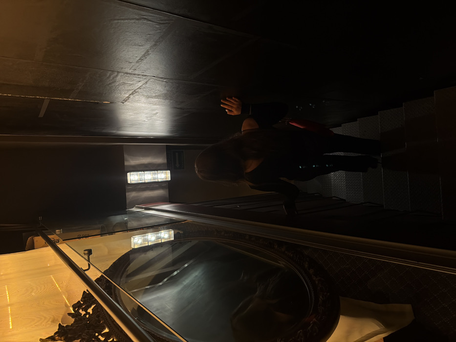 A dimly lit interior scene focuses on a woman descending metal stairs, her dark hair and clothing blending with the shadows. Above her is a black ceiling with subtle reflections. Below, a decorative glass table reflects a mirrored fixture on the wall, adding complexity to the visual. The setting appears to be a stylish, possibly public, space with contrasting textures and light.