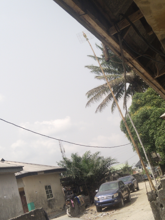 The image depicts a static outdoor scene on an unpaved road in Lekki, Nigeria, observed from beneath a wooden roof overhang. The overhead structure in the upper right quadrant displays wooden planks, supporting beams, and attached electrical wiring along with a reddish pipe segment. A long, slender bamboo pole extends diagonally from this structure towards the upper right, culminating in a rectangular grid antenna against a hazy, light grey sky. A thick, black utility cable traverses the upper mid-ground horizontally. The unpaved road, composed of dirt and loose gravel, occupies the central lower portion of the frame. Two vehicles are parked on the right side of this road, facing away from the viewer: a blue Ford Ranger pickup truck in the foreground, followed by a dark-colored SUV partially visible behind it. To the left of the road, a single-story, light-colored concrete building with a dark corrugated roof and a single, white-grilled window is present. A partial, unpainted building structure is visible further left. Vegetation is prominent, including a large palm tree in the upper right, partially obscured by the roof overhang. Dense green foliage, consistent with a tropical tree, is visible to its right. Shorter, bush-like palm vegetation grows on the left side of the road, behind the blue truck. A second, thinner, light-colored pole stands vertically on the far right edge of the road. Concrete barrier blocks line sections of the road's perimeter. Multiple garments are observed hanging on a low structure near the parked vehicles. In the distant background, a lattice telecommunications tower is faintly discernible against the overcast sky. No human figures are present within the scene.