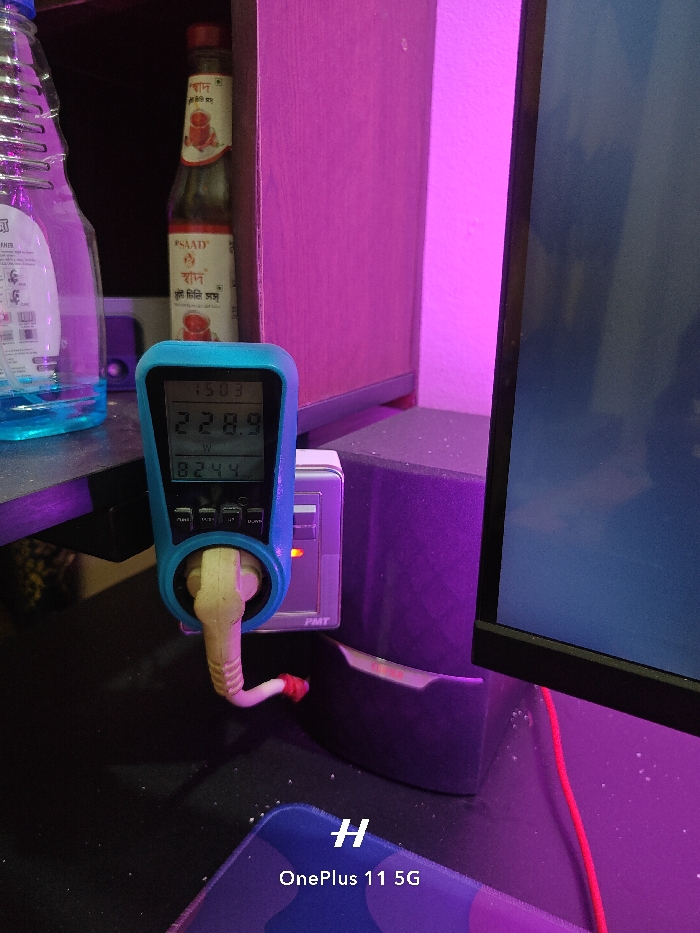 A blue digital power meter is plugged into an electrical outlet. The meter reads 228.9W and 824. The power meter is connected to a flat screen TV. The scene appears to be a bedroom or home office. The coordinates 24.388, 88.592 locate this image in Rajshahi, Bangladesh.