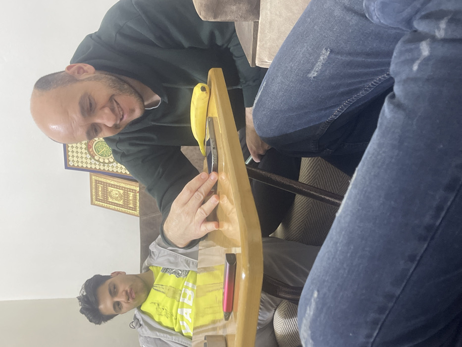 Two men are at a table. One, in a green sweater, looks at a banana balanced precariously on a wooden object, a knife positioned nearby. His hand hovers close. The second man, wearing a yellow t-shirt, gazes towards the camera. A pink vape device rests on the wooden object. The table sits against a wall decorated with framed Islamic art. A pair of blue jeans are partially visible, suggesting another person is present.