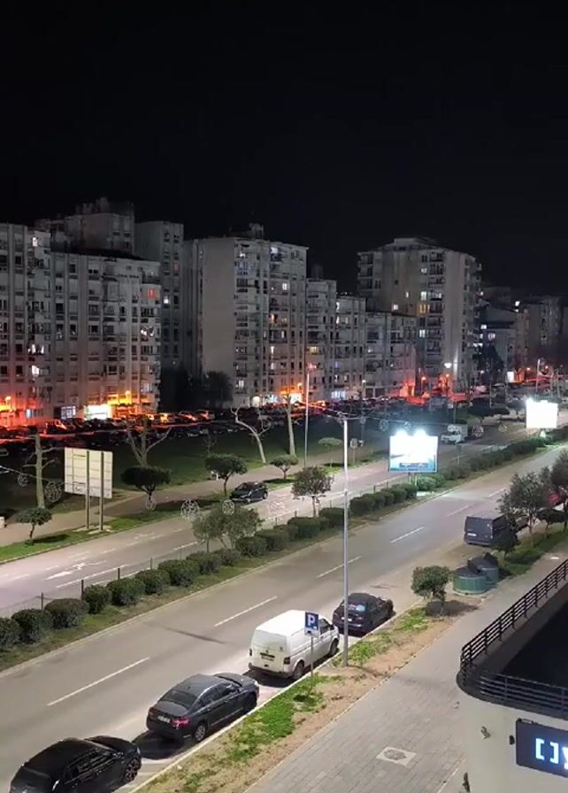 n aerial view of a city street at night. Buildings line the left side of the street, and a median separates the street lanes. Cars are parked on the street and driving on the lanes. Streetlights illuminate the scene. Vegetation is present along the median and sidewalks. A bridge or elevated walkway is visible on the right side of the frame. The night sky is dark.