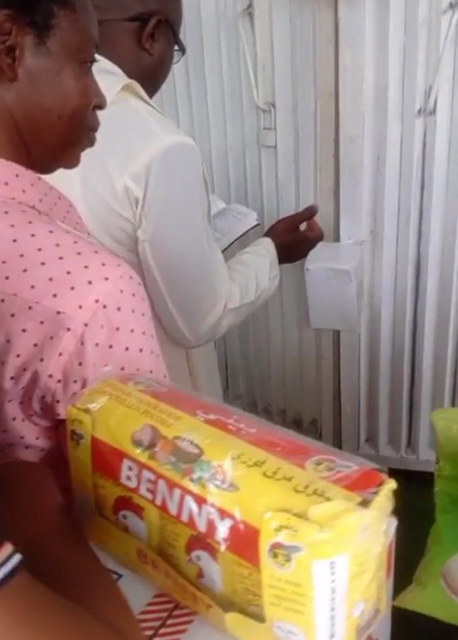Three individuals are present in the scene. The person closest to the camera is wearing a pink, polka-dotted shirt. The next person, a man with glasses, is in a white shirt, looking at a small white container attached to a light gray wall with vertical lines. He has a document in his left hand. In the foreground, there's a box labeled "BENNY" in bold red letters. The box is yellow and features an image of a rooster. Another box, partially visible, has the number "01062" printed on it. The setting appears to be an indoor space, possibly a store or storage area. The man in the white shirt is interacting with the small white container, perhaps checking or depositing something.