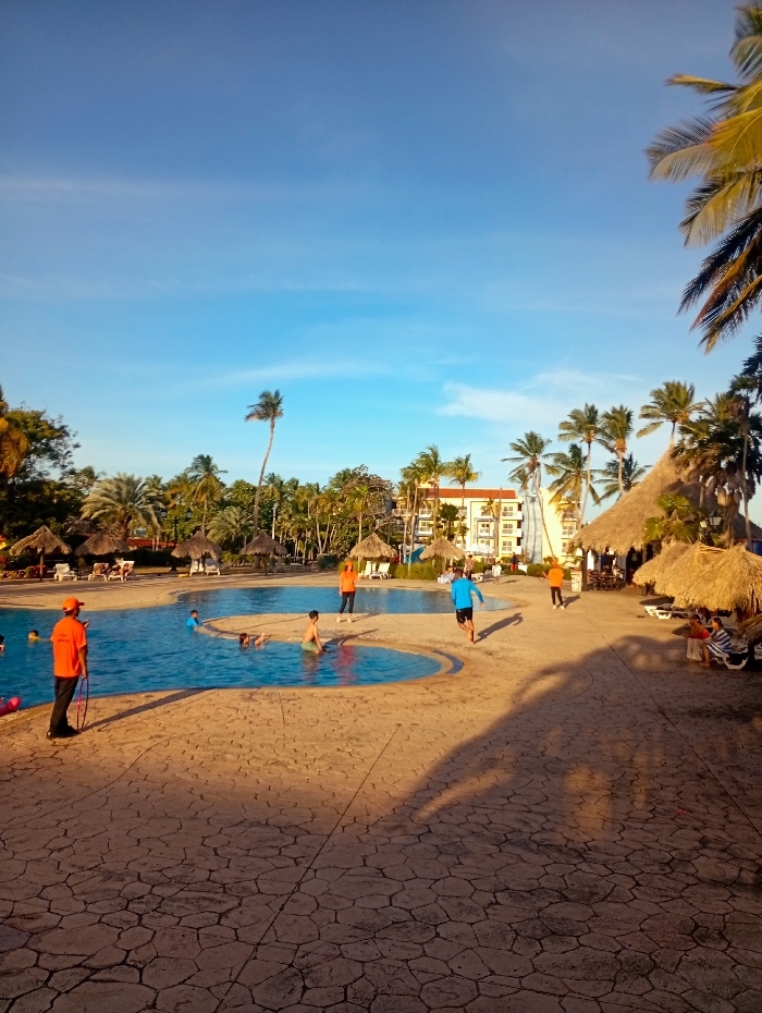 - "The image depicts an outdoor swimming pool complex located in Playa El Agua, Venezuela, under a clear blue sky during what appears to be late afternoon or early evening, evidenced by long shadows cast across the ground" by FM-xUvng2, licensed under CC BY 4.0