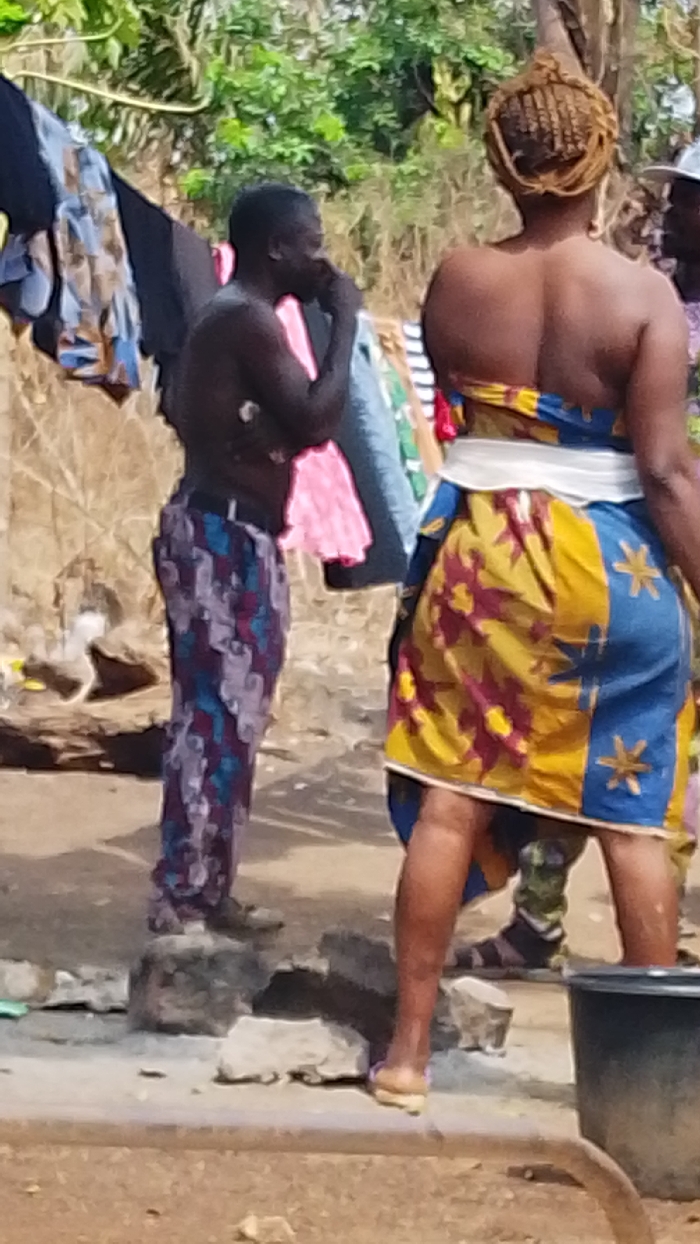 A man with no shirt and patterned pants stands on a rock, hand near his face, next to a clothesline with assorted garments. To the right, a woman with intricate braided hair wears a blue and yellow strapless dress with star and flower designs. A man in camouflage pants stands partly behind her, and a black bucket is in the foreground. The scene appears to be outdoors in a somewhat rural or impoverished setting.