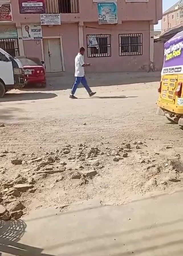 street scene in a dusty environment. In the foreground, there's a partially visible sidewalk and a rough, uneven road surface. A yellow three-wheeled vehicle, with purple branding promoting "PalmPay" and "Send Money, Zero Fees," is parked on the right side of the road. A person wearing a white shirt and blue jeans walks across the road from left to right, passing in front of the vehicle. In the background, there is a two-story building with posters and barred windows. To the right of this building, another building with a lighter color can be seen. The sky is bright and clear, suggesting a sunny day.